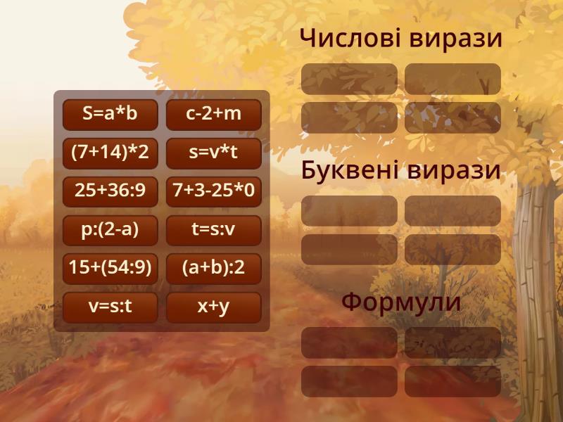 Числові вирази: (7+14)*2, 25+36:9, 7+3-25*0, 15+(54:9), Буквені вирази: (a+b):2, c-2+m, p:(2-a), x+y, Формули: s=v*t, v=s:t, S=a*b, t=s:v,