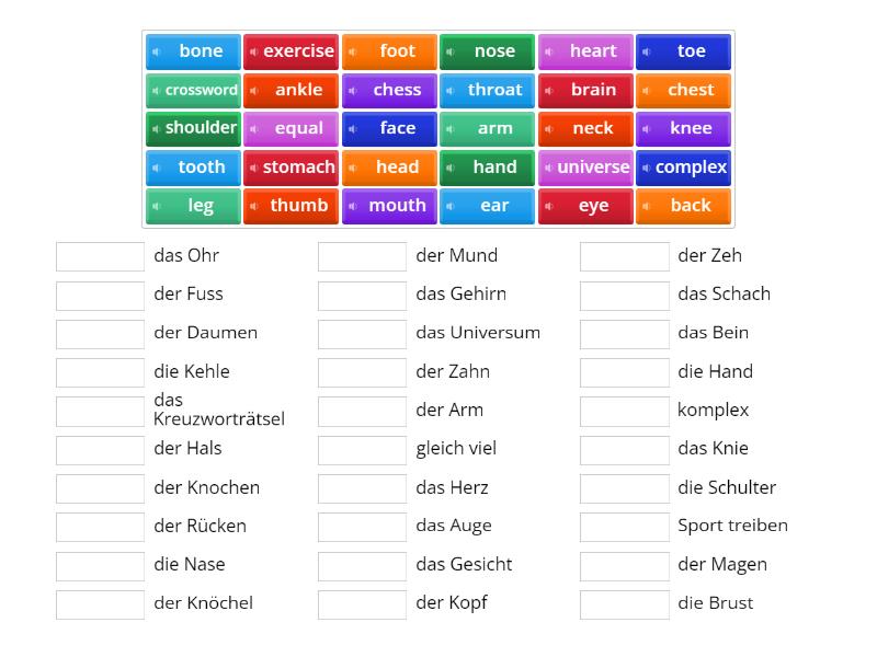ankle - der Knöchel, arm - der Arm, back - der Rücken, bone - der Knochen, brain - das Gehirn, chest - die Brust, complex - komplex, ear - das Ohr, eye - das Auge, face - das Gesicht, foot - der Fuss, hand - die Hand, head - der Kopf, heart - das Herz, knee - das Knie, leg - das Bein, mouth - der Mund, neck - der Hals, nose - die Nase, shoulder - die Schulter, stomach - der Magen, throat - die Kehle, thumb - der Daumen, toe - der Zeh, tooth - der Zahn, universe - das Universum, chess - das Schach, crossword - das Kreuzworträtsel, equal - gleich viel, exercise - Sport treiben,