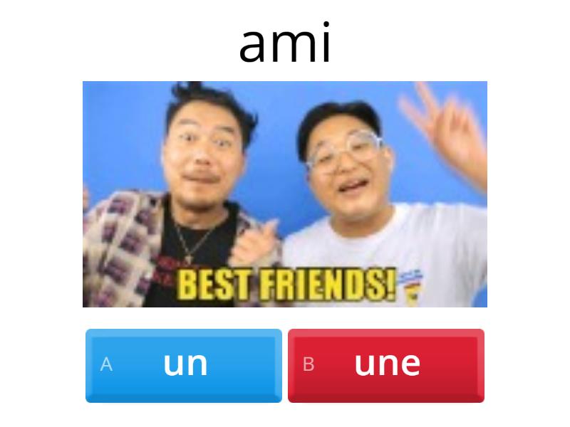 1) ami a) un b) une 2) amie a) une b) un 3) dessin a) un b) une 4) photo a) une b) un 5) amis a) un b) des 6) prénom a) un b) une 7) nom a) une b) un 8) surnom a) un b) une 9) pseudo a) une b) un 10) ado a) une b) un 11) fille a) une b) un