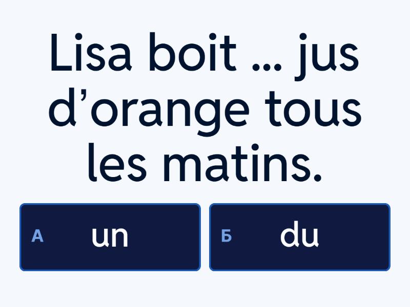 1) Lisa boit ... jus d’orange tous les matins. a) un b) du 2) Prends ... pomme pour le pique-nique ! a) une b) de la 3) Tu veux boire ... eau ? a) une b) de l’ 4) Ce café est servi avec ... crème. a) une b) de la 5) Vous avez de la chance, il me reste ... croissant. a) un b) du 6) Vous mettez ... sauce tomate sur vos pizzas ? a) du b) de la 7) Est-ce qu’il y a ... framboises dans cette recette ? a) de la b) des 8) Il veut ... miel dans son thé ? a) du b) de l’