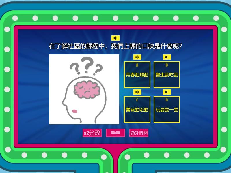 1) 在了解社區的課程中,我們上課的口訣是什麼呢? a) 青春動雌動 b) 醫生動吃動 c) 醫玩動吃動 d) 玩耍動一動 2) 到全民健保特約診所就醫時,需要攜帶什麼證件呢? a) 身分證 b) 會員卡 c) 駕照 d) 健保卡 3) 四個等級的醫院分級制度中,請問哪一個的數量最多呢? a) 基層診所 b) 地區醫院 c) 區域醫院 d) 醫學中心 4) 醫院分級制度對病患有許多好處,哪一個答案不是它的優點呢? a) 省荷包 b) 省空間 c) 省時間 d) 省煩惱 5) 四個等級的醫院分級制度中,請問哪一個的等級最高呢? a) 基層診所 b) 地區醫院 c) 區域醫院 d) 醫學中心 6) 哪一個網站可以查到各地區院所的資料呢? a) 中央健康保險署 b) 國民及學前教育署 c) 國土管理署 d) 迪士尼米老鼠 7) 如果我們感冒了,應優先前往哪一個層級的單位看醫生呢? a) 醫學中心 b) 區域醫院 c) 地區醫院 d) 基層診所 8) 如果到達診所發現忘記帶健保卡了,請問還可以看醫生嗎? a) 不可以 b) 可以 9) 四個等級的醫院分級制度中,請問哪一個的掛號費最少呢? a) 基層診所 b) 地區醫院 c) 區域醫院 d) 醫學中心 10) 健保卡上有許多個人的資料,請問哪一個資料沒有呢? a) 姓名 b) 出生年月日 c) 地址 d) 身分證字號