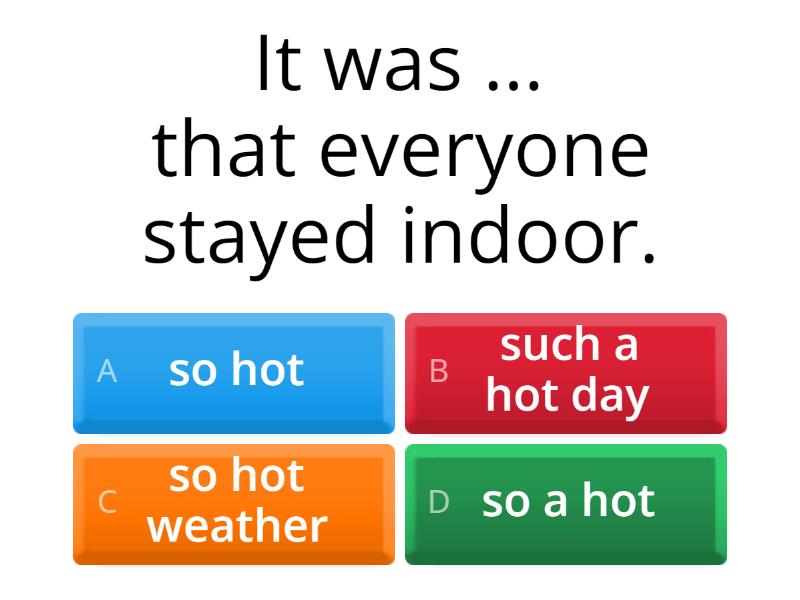 1) It was ... that everyone stayed indoor. a) so hot b) such a hot day c) so hot weather d) so a hot 2) He was ... , he only got good marks. a) so clever b) such smart c) such clever d) such a clever boy 3) Exercise 3 is ... that nobody can get it right. a) such a difficult exercise b) so difficult c) such hard exercise d) such hard 4) My dog is ... that everyone loves it. a) so wonderful b) such a nice pet c) such nice d) so wonderful pet 5) The film was ... good that the friends decided to see it once again.  a) so b) such a c) such an d) such 6) Bird-watching is ... exciting hobby that more and more people take it up every year. a) so b) such a c) such an d) such 7) Harry Potter is ... popular film! Everyone loves the actors and the music. a) so b) such a c) such an d) such 8) Tina was ... excited after the party that she left her umbrella behind. a) so b) such a c) such an d) such 9) Dogs are .... friendly and faithful! They never let us down. a) so b) such a c) such an d) such 10) It is ... good news! We must tell it everyone. a) so b) such a c) such an d) such