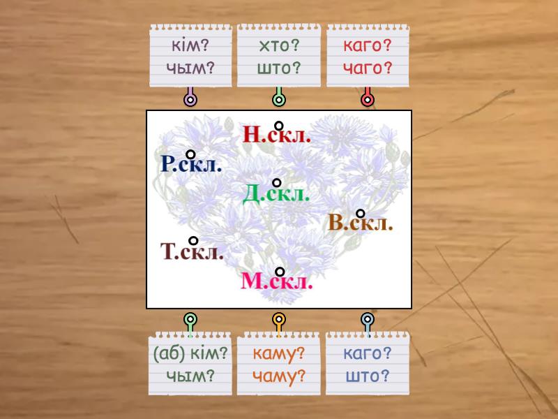 хто? што?, каго? чаго?, каму? чаму?, каго? што?, кім? чым?, (аб) кім? чым?.