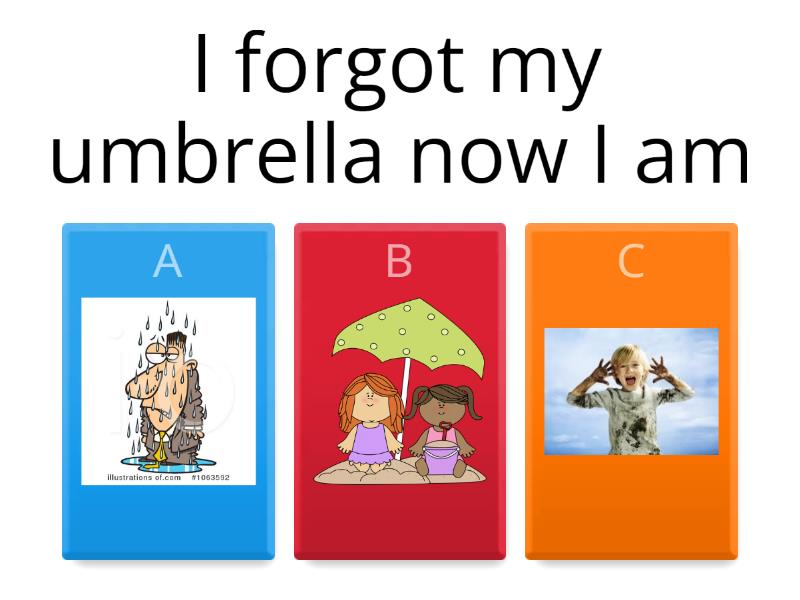 1) I forgot my umbrella now I am a) b) c) 2) I am cold. What do I need. a) b) c) 3) Jenna said, "I want to see the tigers first". Where might Jenna be? a) b) c) 4) Mom said to Maddy,"Do not forget your backpack." Where is Maddy going? a) Park b) Beach c) School 5) Elizabeth went outside with an umbrella and a coat. What might be the weather be like? a) sunny b) rainy c) windy 6) Aspen was listening to Maddy talk and then laughed. Why do you think Aspen laughed? a) Aspen was happy to see Maddy. b) Aspen sneezed. c) Maddy said something funny. 7) The flower in the vase was starting to droop. Why do you think the flower was starting to droop? a) The flower hasn't been watered. b) The flower was made of plastic. c) The flower was growing. 8) Mom was making a bottle of milk for the baby. The baby was crying. Why do you think the baby is crying? a) The baby was hungry. b) The baby wants to play. c) The baby wants a bath.