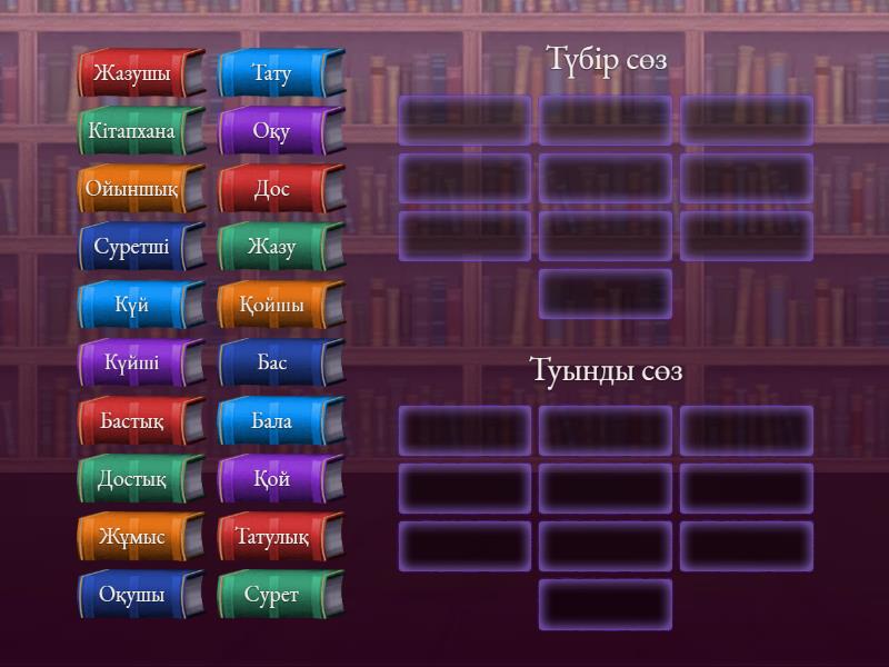 Түбір сөз: Бала, Жұмыс, Оқу, Күй, Тату, Дос, Жазу, Қой, Бас, Сурет, Туынды сөз: Ойыншық, Оқушы, Татулық, Достық, Жазушы, Күйші, Бастық, Суретші, Кітапхана, Қойшы,