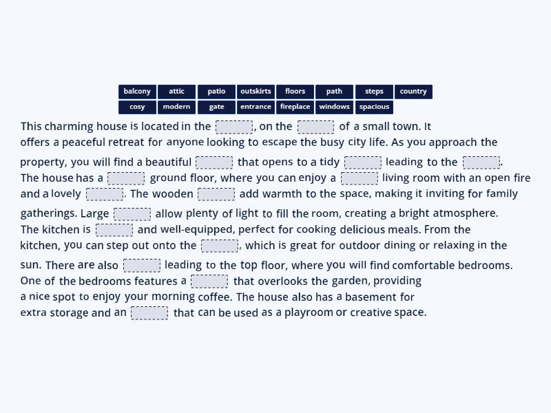 This charming house is located in the ____, on the ____ of a small town. It offers a peaceful retreat for anyone looking to escape the busy city life. As you approach the property, you will find a beautiful ____ that opens to a tidy ____ leading to the ____. The house has a ____ ground floor, where you can enjoy a ____ living room with an open fire and a lovely ____. The wooden ____ add warmth to the space, making it inviting for family gatherings. Large ____ allow plenty of light to fill the room, creating a bright atmosphere. The kitchen is ____ and well-equipped, perfect for cooking delicious meals. From the kitchen, you can step out onto the ____, which is great for outdoor dining or relaxing in the sun. There are also ____ leading to the top floor, where you will find comfortable bedrooms. One of the bedrooms features a ____ that overlooks the garden, providing a nice spot to enjoy your morning coffee. The house also has a basement for extra storage and an ____ that can be used as a playroom or creative space. The exterior of the house is equally ____, with a ____ that adds character to the ____. The walls are made of ____. The ____ is well-kept and offers plenty of ____ space for children to play or for gardening. This lovely home is perfect for anyone who wants to live in the ____ and enjoy a quiet lifestyle. It is an ideal ____ for families or anyone looking for a place to live, and it’s something you can truly ____ if you are seeking a peaceful life away from the hustle and bustle of city living.