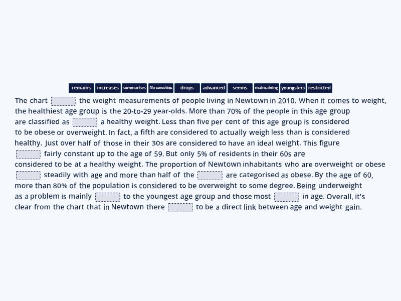 The chart ____ the weight measurements of people living in Newtown in 2010. When it comes to weight, the healthiest age group is the 20-to-29 year-olds. More than 70% of the people in this age group are classified as ____ a healthy weight. Less than five per cent of this age group is considered to be obese or overweight. In fact, a fifth are considered to actually weigh less than is considered healthy. Just over half of those in their 30s are considered to have an ideal weight. This figure ____ fairly constant up to the age of 59. But only 5% of residents in their 60s are considered to be at a healthy weight. The proportion of Newtown inhabitants who are overweight or obese ____ steadily with age and more than half of the ____ are categorised as obese. By the age of 60, more than 80% of the population is considered to be overweight to some degree. Being underweight as a problem is mainly ____ to the youngest age group and those most ____ in age. Overall, it's clear from the chart that in Newtown there ____ to be a direct link between age and weight gain.