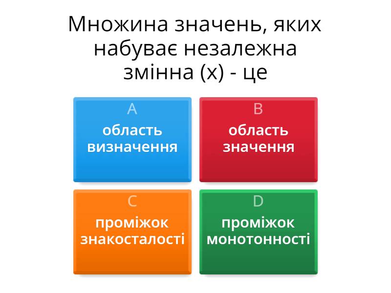 1) Множина значень, яких набуває незалежна змінна (x) - це a) область визначення b) область значення c) проміжок знакосталості d) проміжок монотонності 2) Функція у=kx+b називається a) пряма пропорційність b) обернена пропорційність c) квадратична d) степенева e) лінійна 3) По якій траекторії рухається м'яч після удару по ньому футболістом? a) Парабола b) Гіпербола c) Пряма d) Вітка параболи 4) Множина значень, яких набуває залежна змінна (y) - це a) область визначення b) область значення c) проміжок знакосталості d) проміжок монотонності 5) Значення аргументу, при яких значення функції дорівнює нулю - це a) екстремум функції b) найбільше значення функції c) найменше значення функції d) нулі функції 6) Проміжки, на яких функція набуває лише додатніх або лише від’ємних значень - це a) проміжки монотонності b) проміжки знакосталості c) проміжки зростання d) проміжки спадання 7) Якщо більшому значенню функції на деякому проміжку відповідає більше значення аргументу, то на цьому проміжку функція a) зростає b) спадає c) парна d) непарна 8) Знайдіть область визначення функції у=2х+5 a) множина усіх чисел b) х>0 c) x<0 d) x=0 9) Знайдіть нулі функції у=х2-9 a) -3 b) 3 c) -9 d) -3; 3 10) Визначіть спосіб задання функції a) аналітичний b) графічний c) табличний d) описовий