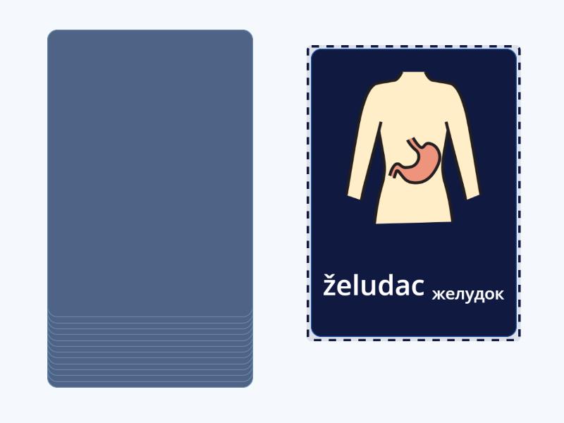 srce сердце, pluća лёгкие, jetra печень, bubreg, bubrezi почка, почки, stomak живот, crevo кишка, mozak мозг, želudac желудок, slezina селезёнка, pankreas поджелудочная железа, mokraćna bešika мочевой пузырь, digestivni trakt желудочно-кишчный тракт, nervni sistem нервная система, krvni sudovi кровеносные сосуды.