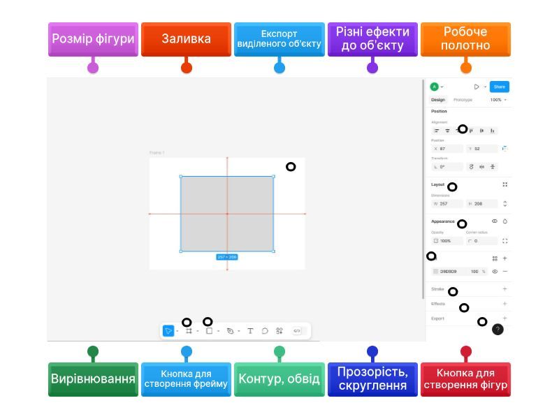 Кнопка для створення фрейму, Кнопка для створення фігур, Робоче полотно, Вирівнювання, Розмір фігури, Прозорість, скруглення, Контур, обвід, Заливка, Різні ефекти до об'єкту, Експорт виділеного об'єкту.