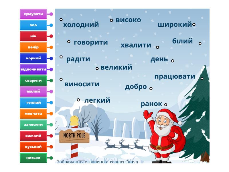 теплий, ніч, мовчати, низько, сумувати, чорний, заносити, вузький, відпочивати, зло, важкий, вечір, сварити, малий.