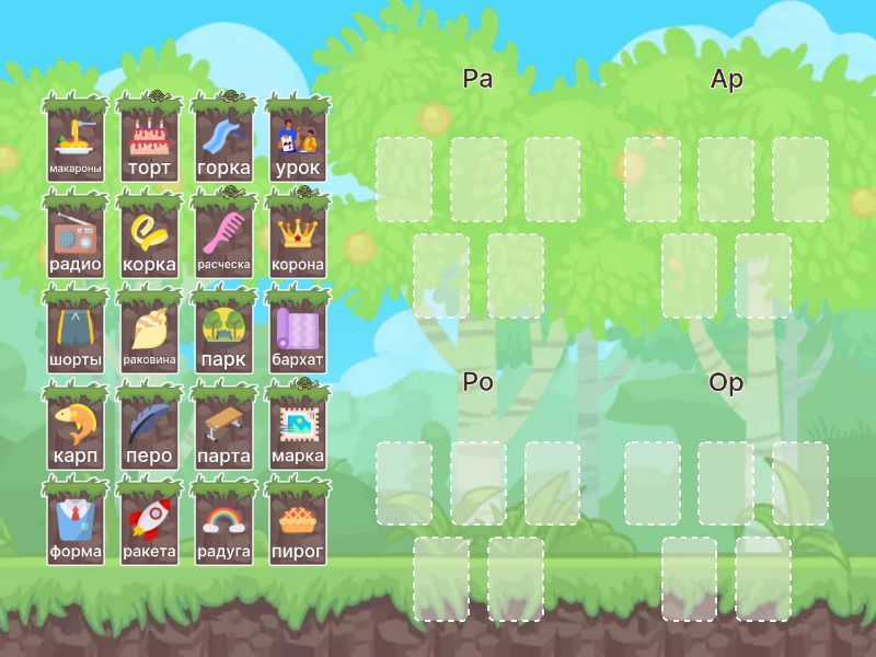 Ра: радио, ракета, раковина, радуга, расческа, Ар: парк, карп, марка, парта, бархат, Ро: урок, корона, макароны, перо, пирог, Ор: горка, шорты, форма, корка, торт,