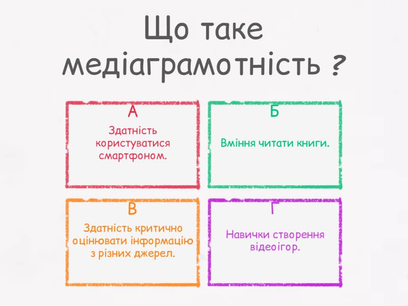 1) Що таке медіаграмотність ? a) Здатність користуватися смартфоном. b) Вміння читати книги. c) Здатність критично оцінювати інформацію з різних джерел. d) Навички створення відеоігор. 2) Що таке фейкова новина ? a) Новина, яка сподобалася багатьом людям. b) Новина, яка містить неправдиву або спотворену інформацію. c) Новина, яка вийшла раніше за інші. d) Новина, яку написав невідомий автор. 3) Який з наведених нижче факторів НЕ є ознакою фейкової новини ? a) Емоційно забарвлена мова. b) Джерело інформації є авторитетним. c) Відсутність посилань на першоджерела. d) Сенсаційні заголовки. 4) Чому важливо розвивати критичне мислення ?  a) Щоб швидше виконувати домашні завдання. b) Щоб стати популярним в соціальних мережах. c) Щоб краще грати в комп'ютерні ігри. d) Щоб уміти відрізняти правду від брехні в інформаційному просторі. 5) Які з наведених джерел інформації можуть бути найбільш упередженими ? a) Наукові статті. b) Підручники. c) Блоги та особисті веб-сайти. d) Енциклопедії. 6) Як перевірити достовірність інформації в Інтернеті ? a) Перевірити інформацію з кількох незалежних джерел. b) Повірити всьому, що написано. c) Запитати думку друга. d) Подивитися, скільки людей поділилося цією інформацією. 7) Які риси характерні для критичного мислення ? a) Довірливість, легковірність b) Скептицизм,аналітичність, об'єктивність c) Емоційність,суб'єктивність d) Нетерпимість до іншої думки 8) Як навчитися критично мислити ? a) Читати різноманітну літературу, задавати питання, аналізувати інформацію, шукати докази. b) Дивитися більше телевізора. c) Грати в комп'ютерні ігри. d) Слухати думку авторитетних людей. 9) Які ризики несе в собі надмірна кількість часу , проведеного в соціальних мережах ? a) Можливість знайти нових друзів. b) Розвиток залежності від Інтернету. c) Кібербулінг d) Усі відповіді, крім А. 10) Як захистити свої персональні дані в Інтернет ? a) Не використовувати складні паролі. b) Відкривати всі підозрілі посилання. c) Не ділитися особистою інформацією з незнайомцями. d) Ігнорувати налаштування приватності в соціальних мережах.