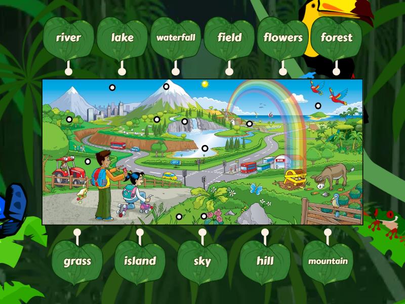 field, flowers, forest, grass, hill, island, lake, mountain, river, sky, waterfall.