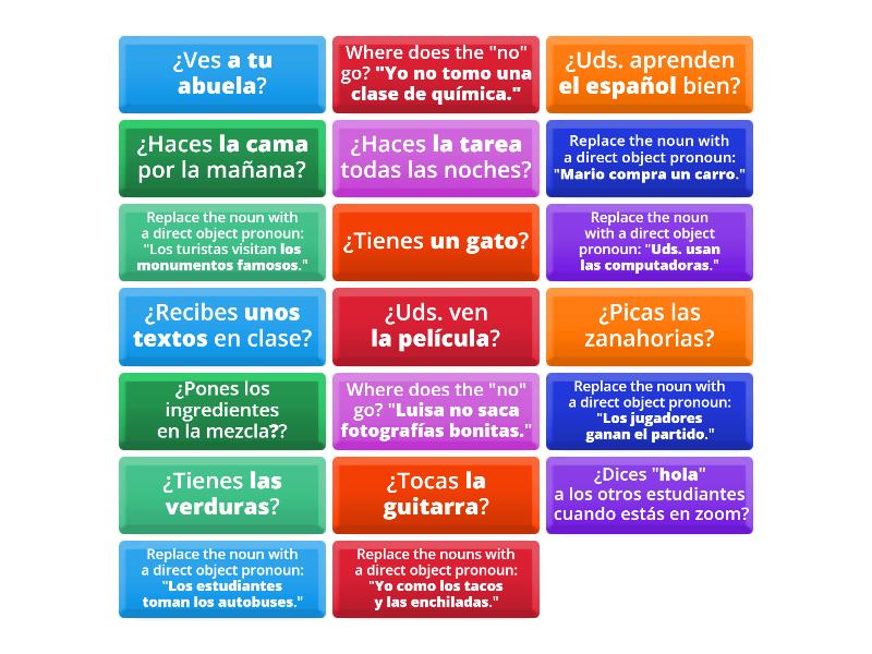 ¿Tienes un gato? - Sí, lo tengo., ¿Tienes las verduras? - Sí, las tengo., ¿Recibes unos textos en clase? - No, nunca los recibo., ¿Haces la tarea todas las noches? - Sí, la hago., ¿Picas las zanahorias? - No, no las pico., ¿Haces la cama por la mañana? - Sí, la hago., ¿Pones los ingredientes en la mezcla?? - Sí, los pongo. , ¿Dices "hola" a los otros estudiantes cuando estás en zoom? - Sí, los digo. , ¿Uds. ven la película? - Sí, la vemos., ¿Ves a tu abuela? - Sí, la veo., Replace the noun with a direct object pronoun: "Mario compra un carro." - Lo compra., Replace the noun with a direct object pronoun: "Uds. usan las computadoras." - Las usan., Replace the noun with a direct object pronoun: "Los jugadores ganan el partido." - Lo ganan., Replace the noun with a direct object pronoun: "Los estudiantes toman los autobuses." - Los toman., Replace the nouns with a direct object pronoun: "Yo como los tacos y las enchiladas." - Los como. , Where does the "no" go? "Luisa no saca fotografías bonitas." - Luisa no las saca. , Where does the "no" go? "Yo no tomo una clase de química." - No la tomo., ¿Tocas la guitarra? - No, no la toco. , ¿Uds. aprenden el español bien? - Sí, lo aprendemos., Replace the noun with a direct object pronoun: "Los turistas visitan los monumentos famosos." - Los visitan.,