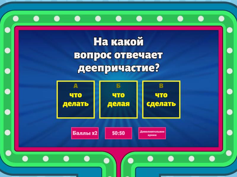 1) На какой вопрос отвечает деепричастие? a) что делать b) что делая c) что сделать 2) Изменяется ли деепричастие? a) да b) нет 3) Есть ли время у деепричастиия? a) нет b) да