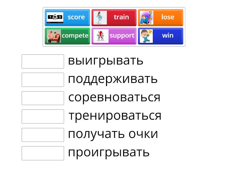 compete - соревноваться, score - получать очки, lose - проигрывать , win - выигрывать , support - поддерживать , train - тренироваться ,
