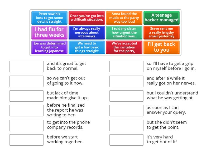I told my sister how urgent the situation was, - but she didn’t seem to get the point., Peter saw his boss to get some details straight - before he finalised the report he was writing to her., We’ve accepted the invitation for the party, - so we can’t get out of going to it now., I’ll get back to you - as soon as I can answer your query., I had flu for three weeks - and it’s great to get back to normal., Once you’ve got into a difficult situation, - it’s very hard to get out of it!, A teenage hacker managed - to get into the phone company records., I’m always really nervous about interviews - so I’ll have to get a grip on myself before I go in., We need to get a few basic things straight - before we start working together., Steve sent me a really lengthy email yesterday - but I couldn’t understand what he was getting at., Joe was determined to get into learning Japanese - but lack of time made him give it up., Anna found the music at the party way too loud - and after a while it really got on her nerves.,
