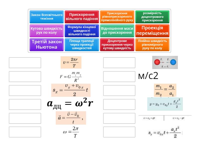 Прискорення рівноприскореного прямолінійного руху, Лінійна швидкість рівномірного руху по колу, Кутова швидкість рух по колу, розмірність доцентрового прискорення - м/с2, Доцентрове прискорення через кутову швидкість, Формула кінцевої швидкості вільного падіння, Прискорення вільного падіння, Проекція переміщення, Площа трапеції через проекції швидкостей, Відношення маси до прискорення, Третій закон Ньютона, Закон Всесвітнього тяжіння,