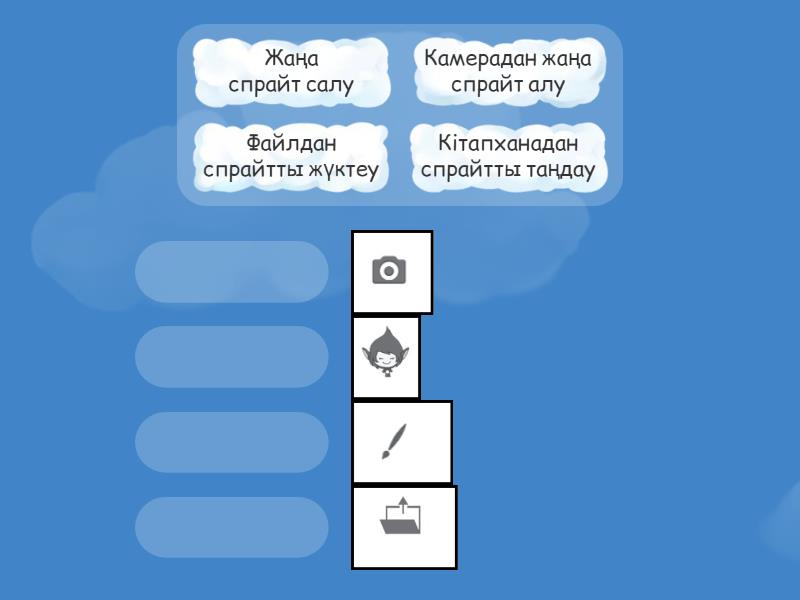 Кітапханадан спрайтты таңдау -     , Жаңа спрайт салу -  , Файлдан спрайтты жүктеу - ,  Камерадан жаңа спрайт алу -  ,
