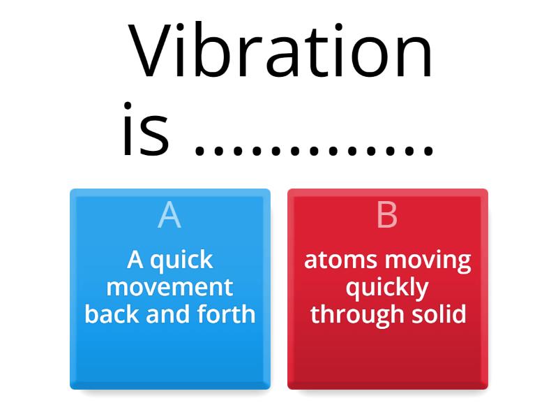 1) Vibration is ............. a) A quick movement back and forth b) atoms moving quickly through solid 2) A sound wave is ........ a) vibrations moving very strongly b) vibrations travelling from a sound source 3) Volume is ............. a) the loudness of the sound b) the pitch 4) Pitch is a) how low or high the light is b) how low or high a sound is 5) Slower vibrations = a) higher pitch b) lower pitch 6) Faster vibrations = a) higher pitch b) lower pitch 7) A whistle being blown  a) creates a high-pitched sound b) creates a lower-pitched sound 8) A rumble of thunder is an example of a a) high-pitch sound. b) low-pitched sound. 9) Sound energy can travel from particle to particle _____________ because the particles are closer together than in other states of matter. a) easier in the air b) easier in a solid 10) When muffling a sound it is best to use .... a) cotton b) wood
