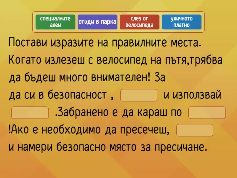 Постави изразите на правилните места. Когато излезеш с велосипед на пътя,трябва да бъдеш много внимателен! За да си в безопасност , ____ и използвай ____ .Забранено е да караш по ____ !Ако е необходимо да пресечеш, ____ и намери безопасно място за пресичане. Какво научих:Избирам безопасно място ____ .Оглеждам се в двете посоки. Ако идват ____ ги изчаквам да преминат. .Пресичам бързо,но без да ____ .