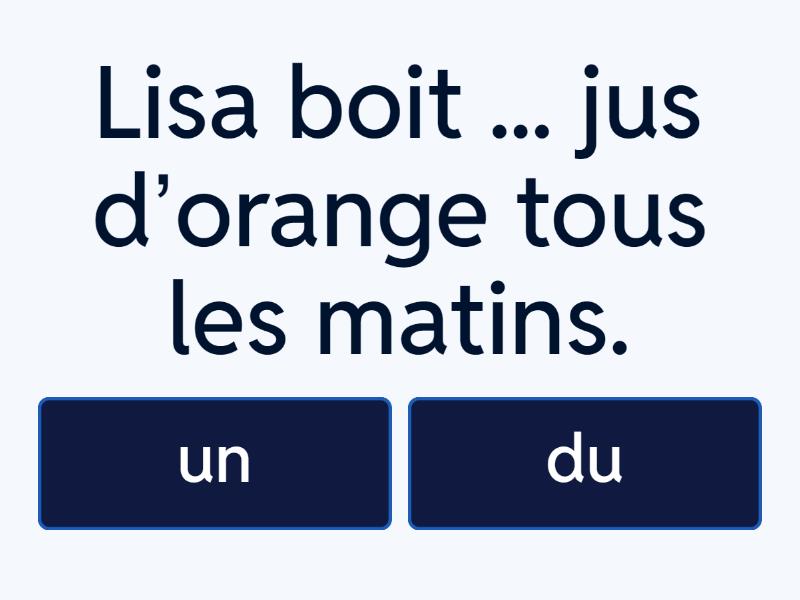 1) Lisa boit ... jus d’orange tous les matins. a) un b) du 2) Prends ... pomme pour le pique-nique ! a) une b) de la 3) Tu veux boire ... eau ? a) une b) de l’ 4) Ce café est servi avec ... crème. a) une b) de la 5) Vous avez de la chance, il me reste ... croissant. a) un b) du 6) Il faut mettre ... œuf sur un croque-madame ? a) un b) de l’ 7) Corentin met ... fromage dans tous ses plats. a) un b) du 8) Ajoutez encore ... tomate, s’il vous plaît. a) une b) un 9) Vous voulez ... mayonnaise avec vos frites ? a) de la b) une 10) Il y a ... ail dans cette sauce, elle pique ! a) une b) de l' 11) Pour cette entrée, prenez ... gros melon. a) un b) de la 12) C’est ... fleur mais tu peux la manger. a) une b) un