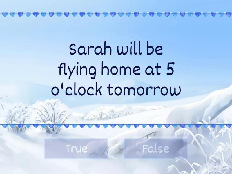 True: Sarah will be flying home at 5 o'clock tomorrow, Bob and Mary will be leaving Moscow next week., Bob won’t be traveling with us next month, he has lost his job.  , I’ll have finished this task by Friday., They will have been living in Florida for twenty years by the end of this year., By September, Susan won’t have been working here for one year., Ann, will you be using your bike this afternoon?, By the time David retires, he won’t have been working in this company for 15 years., By the time we arrive at the station the train will have gone., False: At 11 o'clock tomorrow she will have worked. , I will not be reading that book by next week., I will have clean all the rooms by 3 o’clock., By the time you come back home, I will be doing the chores for three hours., Will they be playing tennis for two hours when I come to the court?, Bob will have watched a football match tomorrow at 9 pm. ,
