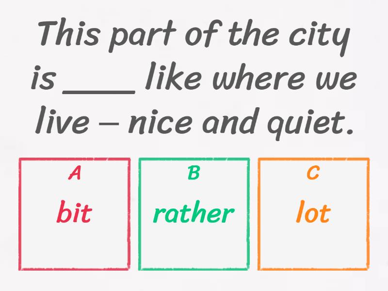 1) This part of the city is ____ like where we live – nice and quiet. a) bit b) rather c) lot 2) You ___ have picked a better location than this, right next to the station a) wouldn't b) can't c) couldn't 3) Living in the suburbs is ___ near as expensive as living in the city centre a) anywhere b) nowhere c) much 4) This bag is ___ like the other one. a) lot b) little c) nothing 5) It’s not so much a City of Culture ___ a City of Traffic! a) as b) than c) like 6) The new café isn’t a ___ on the old one. a) variance b) patch c) nowhere