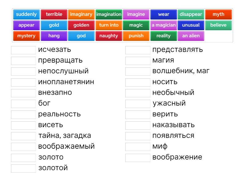 believe - верить, terrible - ужасный, imagine - представлять, imagination - воображение, unusual - необычный, a magician - волшебник, маг, an alien - инопланетянин, mystery - тайна, загадка, myth - миф, reality - реальность, hang - висеть, appear - появляться, disappear - исчезать, wear - носить, turn into - превращать, punish - наказывать, god - бог, magic - магия, gold - золото, golden - золотой, imaginary - воображаемый, suddenly - внезапно, naughty - непослушный,