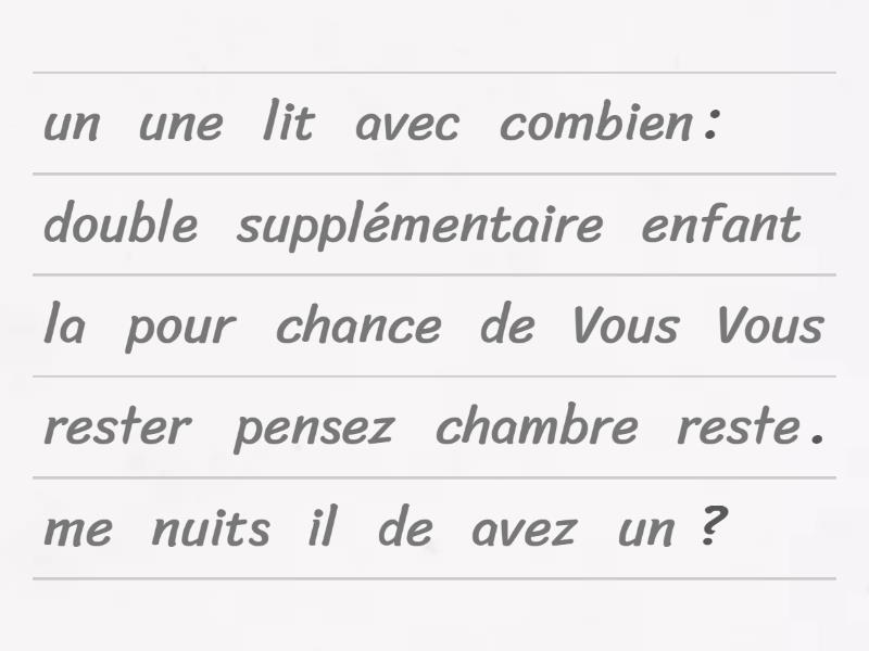Vous avez de la chance: il me reste une chambre double avec un lit supplémentaire pour un enfant. Vous pensez rester combien de nuits ?, Au revoir ! Bon séjour chez nous !, Vous avez réservé ?, Deux nuits. Quel est le prix ?, Bonjour Madame! Nous voudrions une chambre pour une famille de trois personnes., Non, nous n'avons pas réservé. L’hôtel est complet ?, Oui, il est servi au restaurant qui se trouve au deuxième étage entre 7 heures 30 et 10 heures., Alors, une chambre double pour deux nuits, ça fait 200 euros., Le petit déjeuner est compris ? , A quelle heure faut-il rendre la clé avant le départ ?, Avant midi, s'il vous plaît ., Bon, d'accord. Merci, Madame ! Au revoir !,