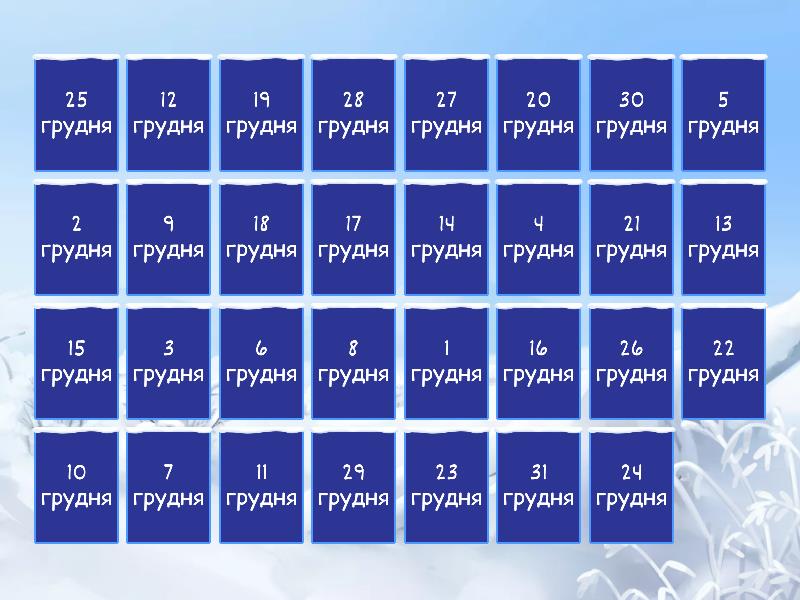 1 грудня - Привітати рідних з першим днем зими, 2 грудня - Подивитися зимові мультики, 3 грудня - Приготувати какао або гарячий шоколад, 4 грудня - Знайти новорічні пісні, 5 грудня - Потанцювати під новорічні пісні, 6 грудня - З'їсти смаколик, 7 грудня - Намалювати сінговика, 8 грудня - Розвісити вогники, 9 грудня - Подивитися новорічний фільм, 10 грудня - Написати листа Діду Морозу, 11 грудня - Фото з ялинкою, 12 грудня - Вирізати сніжинку, 13 грудня - Написати список тих, кого треба привітати з Новорічними святами, 14 грудня - зробити прикрасу для ялинки (кімнати)), 15 грудня - Створити привітальну листівку, 16 грудня, 17 грудня, 18 грудня - Намалювати або розфарбувати янгола, 19 грудня - Взяти участь у танцювальному флешмобі, 20 грудня - Сніжне фото, 21 грудня, 22 грудня, 23 грудня, 24 грудня, 25 грудня, 26 грудня, 27 грудня, 28 грудня, 29 грудня, 30 грудня, 31 грудня,