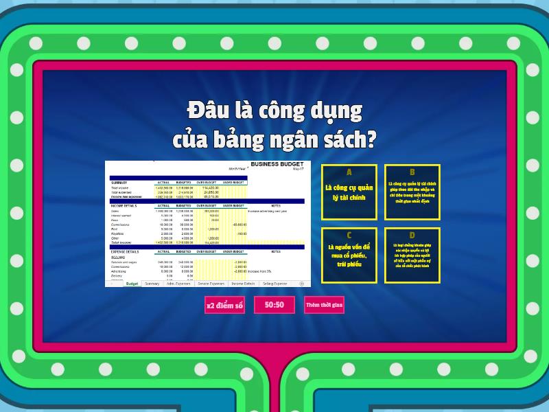 1) Đâu là công dụng của bảng ngân sách? a) Là công cụ quản lý tài chính b) Là công cụ quản lý tài chính giúp theo dõi thu nhập và chi tiêu trong một khoảng thời gian nhất định c) Là nguồn vốn để mua cổ phiếu, trái phiếu d) Là loại chứng khoán giúp xác nhận quyền và lợi ích hợp pháp của người sở hữu với một phần nợ của tổ chức phát hành 2) Mục đích của việc lập bảng ngân sách? a) Quản lý tài chính cá nhân b) Tiết kiệm c) Cả ba mục đích trên d) Lập kế hoạch 3) Kế hoạch tài chính cá nhân bao gồm những gì? a) Mục tiêu tài chính cụ thể, thu nhập, chi tiêu hàng tháng b) Cả 3 ý trên c) Mục tiêu tài chính cụ thể, thu nhập, chi tiêu hàng tháng và các khoản tiết kiệm d) Thu nhập, chi tiêu hàng tháng, các khoản tiết kiệm 4) Nếu thu nhập một tháng của A là 20.000.000 đồng/tháng. Sau khi trả tiền nhà 8.000.000 đồng; tiền điện nước đi lại 3.500.000 đồng; tiền ăn uống tiêu vặt 5 600 000 đồng và muốn để tiết kiệm 1 900 000 đồng. Vậy A sẽ còn được một khoảng bao nhiêu tiền để dùng cho những trường hợp khẩn cấp? a) 700 000 đồng b) 800 000 đồng c) 900 000 đồng d) 1 000 000 đồng 5) Mục đích của việc lập kế hoạch tài chính cá nhân là gì? a) Để giúp cho mỗi người có đủ tiền để đáp ứng các nhu cầu và mục tiêu tài chính trong tương lai. b) Để theo dõi thông tin về thu nhập và chi tiêu c) Để chi tiêu hợp lí d) Để biết khi nào sẽ hết tiền 6) Đâu không phải là biểu hiện của việc lập kế hoạch tài chính cá nhân? a) Lập bảng kế hoạch nhưng không thực hiện theo b) Đề ra mục tiêu tài chính không cụ thể, chi tiêu hằng tháng bất thường c) Lập bảng kế hoạch, thực hiện rõ ràng để đạt được mục tiêu tài chính d) Cả A và B 7) Nếu thu nhập một tháng của Cô Nga là 8 000 000 đồng/tháng. Mỗi tháng cô phải trả 4 500 000 đồng tiền nhà ở, điện nước; 1 500 000 đồng tiền đi lại ăn uống; 500 000 đồng để phòng trường hợp khẩn cấp. Số còn lại cô để tiết kiệm. Cô muốn mua cho con gái một chiếc máy tính giá 10 500 000 đồng, hỏi cô phải mất bao nhiêu tháng để mua được từ số tiền tiết kiệm. a) 7 tháng b) 10 tháng c) 9 tháng d) 5 tháng 8) Có 2 người cùng làm cho một công ty. Người thứ nhất lương một tháng 10 000 000 đồng, người thứ hai lương một tháng 7 000 000. Bảng ngân sách của hai người như sau. Hỏi ai để tiết kiệm được nhiều hơn và nhiều hơn bao nhiêu? a) Người thứ nhất tiết kiệm được nhiều hơn và nhiều hơn 450 000 đồng b) Người thứ nhất tiết kiệm được nhiều hơn và nhiều hơn 550 000 đồng c) Người thứ hai tiết kiệm được nhiều hơn và nhiều hơn 1 350 000 đồng d) Người thứ nhất tiết kiệm được nhiều hơn và nhiều hơn 1 450 000 đồng