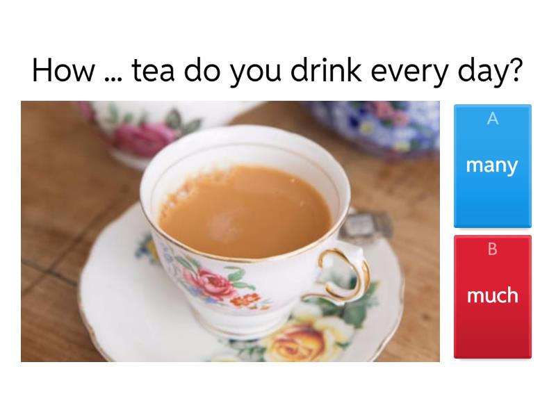 1) How ... tea do you drink every day? a) many b) much 2) How ... sugar do you like in your tea? a) many b) much 3) How ... children are in your family? a) many b) much 4) How ... money do you have in your pocket? a) many b) much 5) How ... sweets did you buy? a) much b) many 6) How ... milk do you drink a day? a) many b) much 7) How ... apples a day do you eat a week? a) much b) many 8) How ... onions did you buy? a) many b) much 9) How ... water do you drink a day? a) many b) much