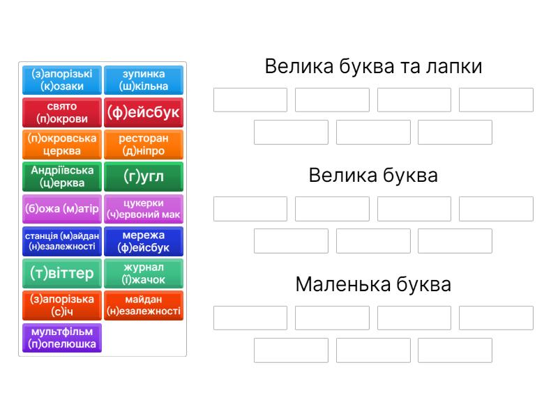 Велика буква та лапки: цукерки (ч)ервоний мак, ресторан (д)ніпро, зупинка (ш)кільна, станція (м)айдан (н)езалежності, мережа (ф)ейсбук, мультфільм (п)опелюшка, журнал (ї)жачок, Велика буква: свято (п)окрови, (б)ожа (м)атір, (з)апорізька (с)іч, (п)окровська церква, майдан (н)езалежності, Маленька буква: (з)апорізькі (к)озаки,  (ф)ейсбук, (т)віттер, (г)угл, Андріївська (ц)ерква,