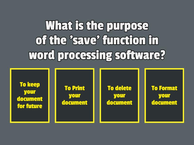 1) What is the purpose of the 'save' function in word processing software? a) To keep your document for future b) To Print your document c) To delete your document d) To Format your document 2) What does the 'bold' formatting option do? a) Make the text darker and thicker b) Underline your text c) Change the colour  d) Make the text slant 3) What is the function of the 'spell check' feature in word processing software? a) Check for spelling mistakes b) Add text to a document  c) Change the format 4) What tab do you use to add a graphic ? a) Insert b) Design c) Layout d) Home 5) What has columns and Rows ? a) Table b) Page Border  c) Graphic d) Shape