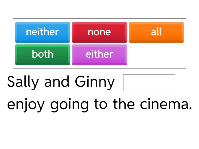 Sally and Ginny ____ enjoy going to the cinema. Ralph and I ____ like playing sport, but ____ of us likes watching it on TV. Which dress do you like: the blue one or the pink one? - Actually, I don't like ____ of them. ____ of my friends are Linkin Park fans. We're going to their concert in September. ____ of my relatives are very patient. They ____ get frustrated easily and shout a lot. I wouldn't like to bump into ____ of my classmates. We didn't get on very well.