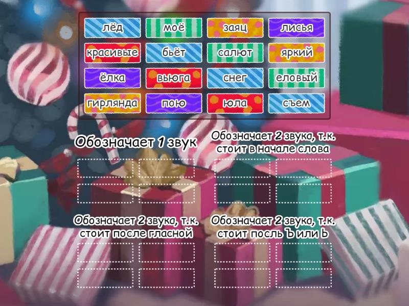 Обозначает 1 звук: снег, лёд, салют, гирлянда, Обозначает 2 звука, т.к. стоит в начале слова: ёлка, юла, яркий, еловый, Обозначает 2 звука, т.к. стоит после гласной: заяц, красивые, моё, пою, Обозначает 2 звука, т.к. стоит посль Ъ или Ь: вьюга, бьёт, съем, лисья,
