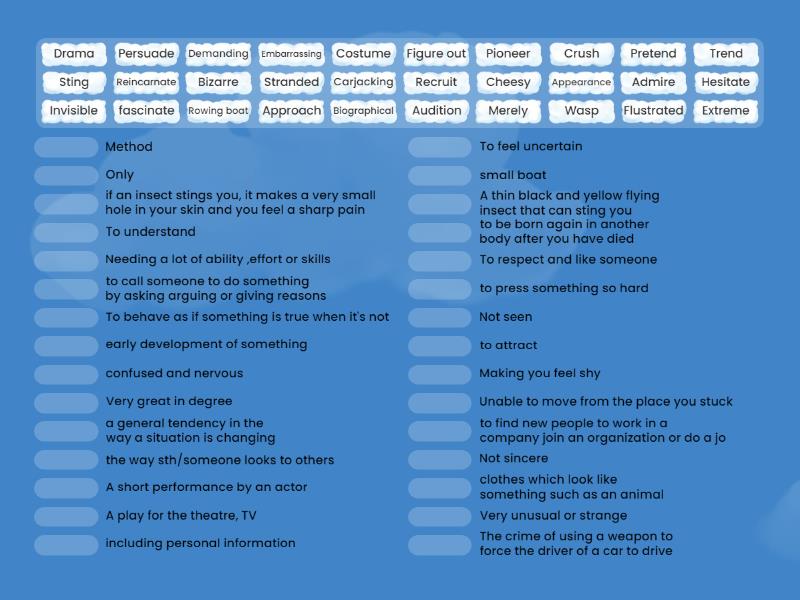 Biographical - including personal information, Appearance - the way sth/someone looks to others, Embarrassing - Making you feel shy, Hesitate - To feel uncertain, Carjacking - The crime of using a weapon to force the driver of a car to drive, Sting - if an insect stings you, it makes a very small hole in your skin and you feel a sharp pain, Wasp - A thin black and yellow flying insect that can sting you, Costume - clothes which look like something such as an animal, Invisible - Not seen, Audition - A short performance by an actor, Drama - A play for the theatre, TV, Pretend - To behave as if something is true when it's not, Admire - To respect and like someone, Cheesy - Not sincere, Rowing boat - small boat, Figure out - To understand, Extreme - Very great in degree, Bizarre - Very unusual or strange, Merely - Only, Approach - Method, Demanding - Needing a lot of ability ,effort or skills, Stranded - Unable to move from the place you stuck, Pioneer - early development of something, Flustrated - confused and nervous, Trend - a general tendency in the way a situation is changing, Persuade - to call someone to do something by asking arguing or giving reasons, Recruit - to find new people to work in a company join an organization or do a jo, Crush - to press something so hard, fascinate - to attract, Reincarnate - to be born again in another body after you have died,