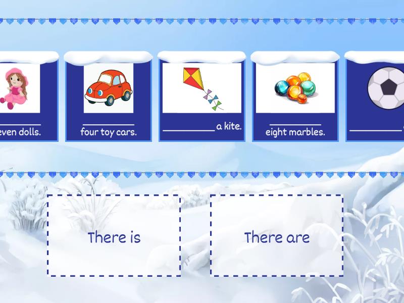 There is: __________ a kite., __________ a toy train. , __________ a ball., __________ a plane., __________ a chess board., There are: __________ eight marbles., __________ four toy cars., __________ eleven dolls., __________ nine teddy bears., __________ twelve blocks.,
