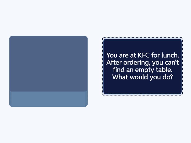 How do you spell your first name?, Do you go to restaurants? Why or why not?, Do you like to travel? Why or why not?, What do you do for fun?, What TV show do you like to watch the most? Why?, How many people are there in your family?, Do you enjoy fast food? Why or why not?, Do you like going shopping? Why or why not?, When is your birthday?, What did you do last night?, Do you play baseball? Why or why not?, What kind of music do you like the best? Why?, Where were you born?, Who is the most famous unforgettable person in your life?, What is the last movie you watched?, Who is your best friend? What is he or she like?, What holiday is your favorite? Why?, Where do your grandparents live?, What are you wearing today?, How often do you watch TV? What do you usually watch?, How do you get to school? How long does it take to get there?, How do you feel when you get the flu?, Do you like reading? Why or why not?, Do you like comic books? Why or why not?, What day is today?, What did you have for breakfast this morning?, What is your favorite color?, What special things do people usually do during Chinese New Year?, What's the weather like in your hometown?, What's your favorite dessert?, When do you wash your face?, Where are you going this weekend? What will you do there?, Where do you usually go shopping?, Where is Kaohsiung? Is it far from your home?, Which season do you like the best? Why?, Your friend is speaking too quickly. What would you say to him?, There is going to be an exhibit at the museum., How much time do you usually spend eating breakfast in the morning?, A person calls one phone and wants to talk to your sister but she is not at home. How do you reply?, There is a dog following you from school. What will you do?, How was the traffic on your way here?, Do you like riding a bicycle?, Tell me about your hometown., Do you think TV is good for children?, How do you go to school every day?, Is your family a big one or a small one?, Describe your living room at home., If you had to live in either Kaohsiung or Taipei, which one would you choose?, Do you often go to the movies? Why or why not?, Do you think it's okay for guys to grow long hair?, Have you ever been to a concert?, How do you usually celebrate your birthday?, What is your favorite sport?, When do you usually go to bed?, Your sister Linda got a love letter. You are very curious about it. What would you ask her?, Do you play video games when you are free?, Do you keep a pet?, Your friend, Brian, will not be here next semester. What will you say to him?, Where do you usually go after school?, How often do you go to the convenience store?, You are waiting for the bus. Suddenly, someone pushes you. What would you say to him?, Which subject do you like more, English or Chinese? Please explain why., How do you usually celebrate your birthday?, You want to talk to your friend George on the phone. What will you say to the person who answers the phone?, You are at a store buying something, but you want a better price. What would you say to the salesperson?, A friend gives you an expensive gift that you really like. What would you say to him or her?, What are your future plans?, You get lost trying to get to the bus station. Ask someone for directions., You are at a hospital visiting a sick friend. What would you say when you are ready to leave?, Tell me about your parents., What do you do?, What would you do if you found a cockroach in your soup at a restaurant?, If you could travel anywhere, where would you go? Why?, At a restaurant, you order spaghetti, but the waiter serves you fried rice by mistake. What do you do?, Your friend doesn't look well. What do you say to them?, Your friend invites you to go out for dinner, but you can't go. What do you say?, Do you sort your trash? Why or why not?, Do you keep a diary?, You must go to Taipei with your grandfather on the train immediately. What would you say to the person at the ticket booth?, You are at KFC for lunch. After ordering, you can't find an empty table. What would you do?, Tell me about one of your hopes., You are waiting for a friend and they are late. They finally arrive and say they are sorry. How do you respond?, Are you scared of any sort of bugs?, What do you do when you feel sad?, How many times do you brush your teeth in a day?, Who is your best friend? Why?, You meet your friend's friend for the first time. Her name is Connie. What would you say to her?, If you needed assistance from someone, how would you ask them for help?, Can you cook anything? If so, what can you make?, While you are watching a movie, your father asks you to go to the store for him. What would you do?, Do you have cable TV at home?, Who do you look up to?, How do you improve your English conversation skills?, You get home one night and realize you are locked out. You don't have your keys and no one is home. What would you do?, If your friend failed an important test, what would you say to make him or her feel better?, If your friends came to see you at home, what would you say to make them feel relaxed?, How can we become healthier?, You see an old friend that you haven't seen for many years. What do you say to him?, What would you say to introduce a good friend to your father?, When you give someone a present, what should you say to them?.