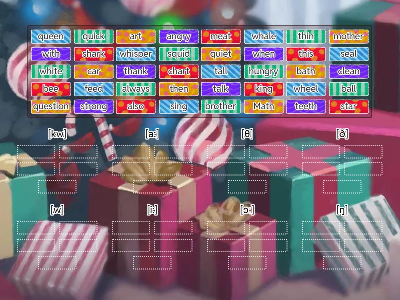 [kw]: question, quiet, quick, queen, squid, [a:]: car, art, shark, star, chart, [θ]: Math, thin, thank, bath, teeth, [ð]: mother, with, this, then, brother, [w]: white, when, whale, whisper, wheel, [i:]: bee, seal, feed, meat, clean, [ɔː]: ball, tall, also, always, talk, [ŋ]: strong, sing, king, angry, hungry,