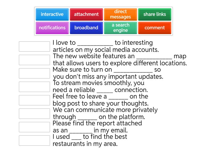 a search engine - I used ___ to find the best restaurants in my area., broadband - To stream movies smoothly, you need a reliable _____ connection., attachment - Please find the report attached as an _______ in my email., interactive - The new website features an ___________ map that allows users to explore different locations., share links - I love to ___________ to interesting articles on my social media accounts., notifications - Make sure to turn on ____________ so you don’t miss any important updates., direct messages - We can communicate more privately through ______ on the platform., comment - Feel free to leave a ______ on the blog post to share your thoughts.,