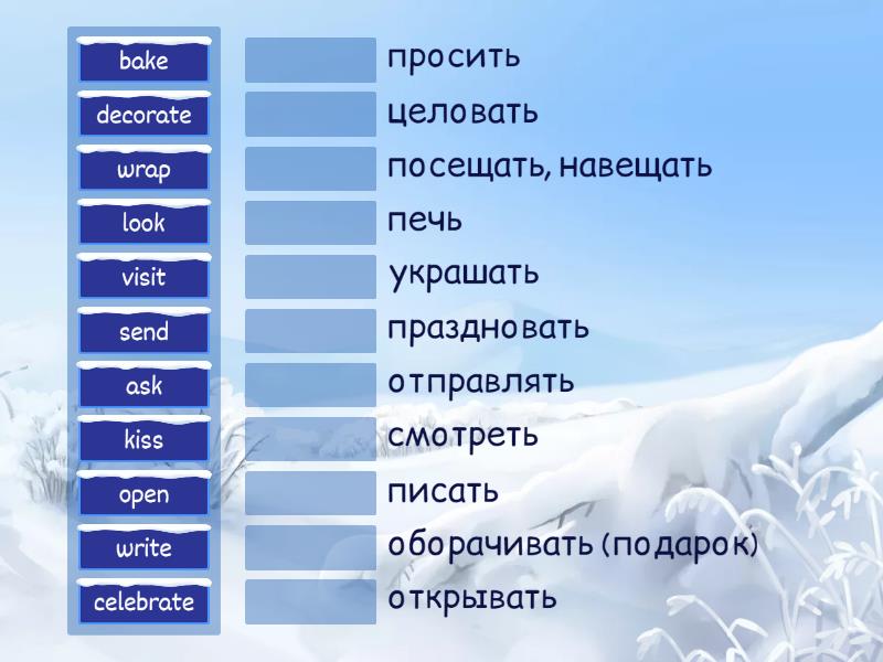 wrap - оборачивать (подарок), write - писать, ask - просить, open - открывать, look - смотреть, send - отправлять, decorate - украшать, visit - посещать, навещать, bake - печь, celebrate - праздновать, kiss - целовать,