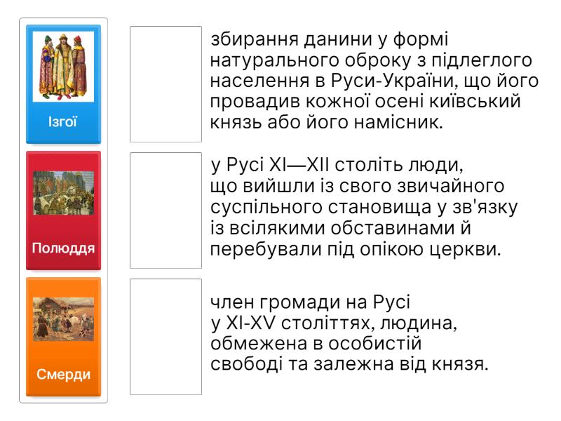 Полюддя - збирання данини у формі натурального оброку з підлеглого населення в Руси-України, що його провадив кожної осені київський князь або його намісник., Смерди - член громади на Русі у ХІ-XV століттях, людина, обмежена в особистій свободі та залежна від князя., Ізгої - у Русі XI—XII століть люди, що вийшли із свого звичайного суспільного становища у зв'язку із всілякими обставинами й перебували під опікою церкви.,