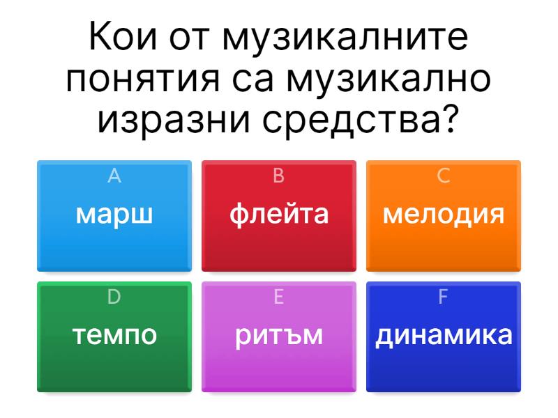 1) Кои от музикалните понятия са музикално изразни средства? a) марш b) флейта c) мелодия d) темпо e) ритъм f) динамика 2) Кои музикални инструменти според вас са най- подходящи за изпълнение на творба с нежен, лиричен и романтичен характер? a) гайда b) барабани c) пиано d) цигулка 3) Коя музика наричаме безмензурна? a) b) 4) Кои инструменти са в групата на струнните? a) флейта b) цигулка c) кларинет d) виолончело e) китара f) арфа 5) Кои инструменти са в групата на ударните ? a) b) c) d) e) f) 6) Кой музикален жанр наричаме "инструментален концерт"? a) концерт с участието на различни инструменти b) песен с аконпанимент c) солово изпълнение на китара d) инструментална музика изпълнявана от едни или повече солисти с аконпанимент на оркестър 7) Електронни и електрически музикални инструменти: a) b) c) d) e) f) 8) Симфонията е творба, която се изпълнява от: a) оркестър от народни инструменти b) симфоничен оркестър c) вокално инструментален състав за популярна музика 9) Мъжки певчески гласове са: a) сопран b) бас c) баритон d) алт e) тенор f) мецосопран 10) Женски певчески гласове са: a) сопран b) баритон c) алт d) мецосопран e) тенор f) бас 11) Отбележете трима известни оперни изпълнители. a) Никола Гяуров b) Райна Кабаиванска c) Лучано Павароти d) Любомир Пипков e) Филип Кутев f) Петко Стайнов 12) Оперета е : a) "Сватбата на Фигаро" b) "Лешникоторошачката" c) "Уестсайдска история" d) "Котките" e) "Набуко" f) "Царицата на чардаша" 13) Балет е : a) Сватбата на Фигаро" b) Уестсайдска история" c) Набуко" d) "Лешникоторошачката" e) "Котките" f) "Царицата на чардаша" 14) Опера е : a) "Царицата на чардаша" b) "Лешникоторошачката" c) Сватбата на Фигаро" d) Уестсайдска история" e) Набуко" f) Котките" 15) Мюзикъл е : a) "Котките" b) "Уестсайдска история" c) "Сватбата на Фигаро d) "Лешникоторошачката" e) "Царицата на чардаша" f) "Набуко" 16) Кои са съвременни български композитори? a) Панчо Владигеров b) Васил Казанджиев c) Красимир Кюркийски d) Петко Стайнов e) Филип Кутев f) Добри Христов 17) Какъв е изпълнителският състав? a) трио b) струнен квартет c) симфоничен оркестър 18) Какъв е изпълнителският състав? a) женски хор b) детски хор c) смесен хор d) мъжки хор 19) Какъв е изпълнителският състав? a) симфоничен оркесетър b) струнен квартет c) камерен оркестър
