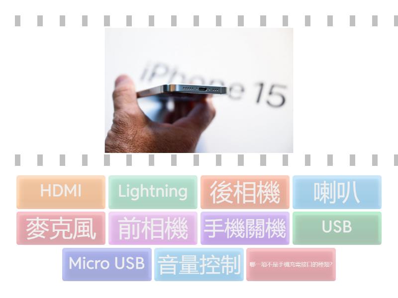 喇叭, 麥克風, HDMI, USB, 前相機, Micro USB, Lightning, 後相機, 手機關機 - 3-5秒, 音量控制, 哪一項不是手機充電接口的種類?,