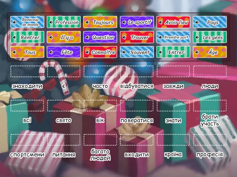 Les gens - люди, Âge - вік, Pays - країна, Tous  - всі, Profession - професія, Il y a  - є, Toujours - завжди, Avoir lieu  - відбуватися, Beaucoup de monde - багато людей, Fête - свято, Le sportif - спортсмени, Question - питання, Entrer  - входити, Rentrer - повератися, Trouver - знаходити, Connaître - знати, Souvent  - часто, Prendre part - брати участь,