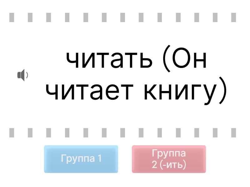 Группа 1 : читать (Он читает книгу), играть (Он играет в парке), отдыхать (Он отдыхает дома), спрашивать (Он спрашивает), отвечать (Он отвечает), делать (Он делает уроки), слушать (Он слушает музыку), думать (Он думает), гулять (Он гуляет в парке), бегать (Он бегает), прыгать (Он прыгает), писать (Он пишет письмо), пить (!) (Он пьёт чай), покупать (Он покупает машину), понимать 理解, Группа 2 (-ить): говорить (Он говорит по-русски)), дарить (Он дарит подарок), любить (Он любит торт), носить (Он носит шапку), учить (Он учит китайский язык), есть (Он есть суп), спать (!) (Он спит ночью), смотреть (!) (Он смотрит фильм), видеть (!) (Он видит кота), помнить 记得, спешить 匆忙, строить 建造, звонить 打电话,