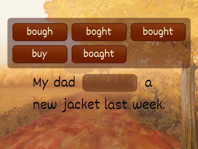 My dad ____ a new jacket last week. I usually ____ a cup of tea in the evening but last night I ____ a glass of milk. He doesn't usually ____ breakfast but yesterday he ____ a sandwich . My mum ____ a letter two days ago. My brother usually draws karate fighters but last Sunday he ____ our cat. I often ____ to the cinema on Saturday night but last month I ____ to a concert . I ____ my friend yesterday morning. He always ____ lunch at two o'clock but yesterday he ____ lunch at one o'clock. Marat ____ his bike yesterday. My mum ____ a yummy cake for my birthday. Marat ____ home at half past eight yesterday morning. Masha ____ a song at school three days ago. Sveta wanted to ____ a teacher but she ____ a doctor. Our English class usually ____ at 10 o'clock but yesterday it ____ at 9. I usullay ____ to Italy but last summer I ____ to Spain. My mum usually ____ me two sandwiches for lunch but yesterday she ____ me only one. I ____ ride a bike but two days ago I ____ ride a horse. My friend usually rides a motorbike to work but last week he ____ off his motorbike. She ____ the news about the accident last night. I usually can't ____ a ball but yesterday I ____ it.